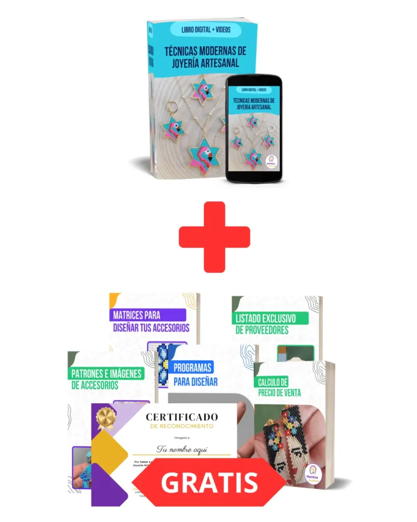 Recibirás el ebook completo con las 4 técnicas de joyería artesanal (peyote par, peyote impar, puntada cuadrada y puntada ladrillo), videos explicativos y 6 bonos adicionales, incluyendo patrones, plantillas, programas de diseño, lista de proveedores, y más.